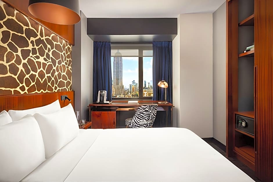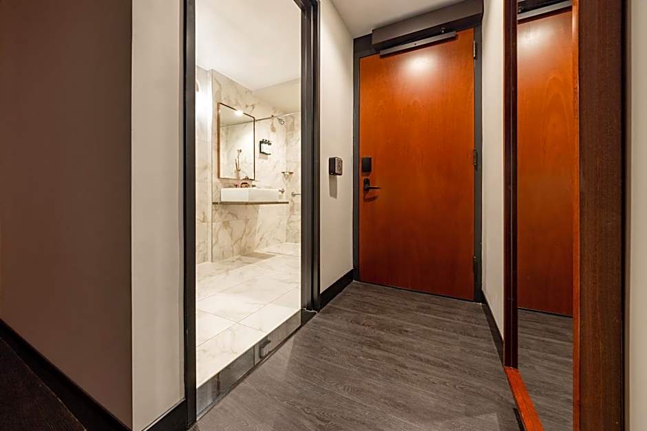 This one king bedded room has air conditioning, and a modern bathroom that features Waterworks fixtures and marble tiles.